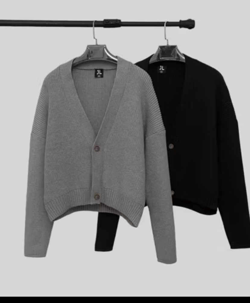 Áo khoác cardigan len cổ V kinh điển trên giá treo. Đây là những item “must-have” (phải có) trong tủ đồ của bất kỳ tín đồ thời trang nào. Sản phẩm có hai tông màu cơ bản là xám trung tính và đen quyền lực. Thiết kế tối giản giúp bạn dễ dàng mix-match với mọi loại trang phục khác nhau.